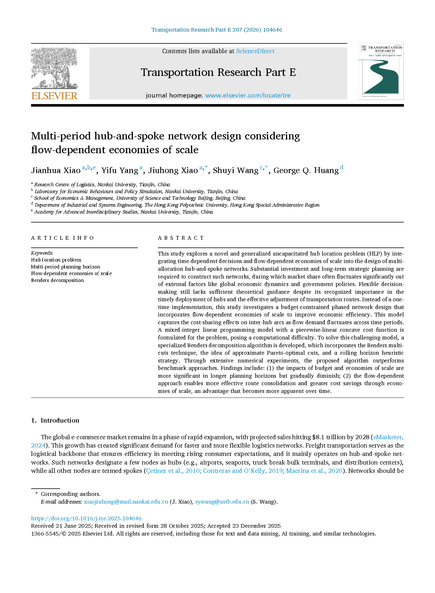 By:Jianhua Xiao,Yifu Yang, Jiuhong Xiao*, Shuyi Wang*, George Q. Huang,Multi-period hub-and-spoke network design considering flow-dependent economies of scale,Transportation Research Part E:Logistics and Transportation Review,Volume 207, March 2026,104646