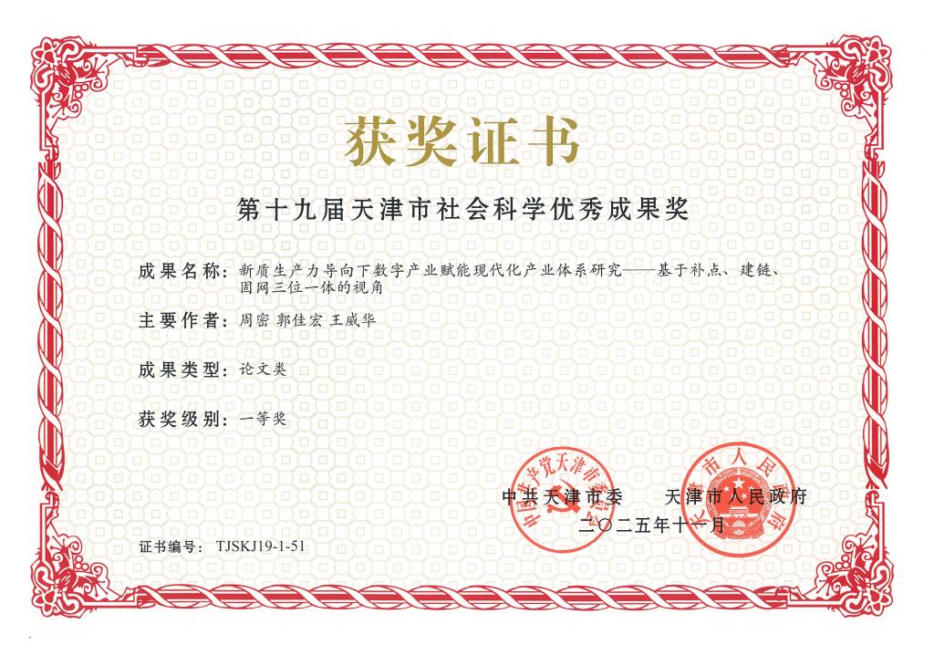 成果简介:该成果获得第十九届天津市社会科学优秀成果奖一等奖,以新质生产力为研究导向,立足补点、建链、固网三位一体的视角,系统探究数字产业赋能现代化产业体系的内在逻辑、实现路径与优化策略,为新时代建设现代化产业体系、培育新质生产力提供了重要的理论支撑与实践指引。