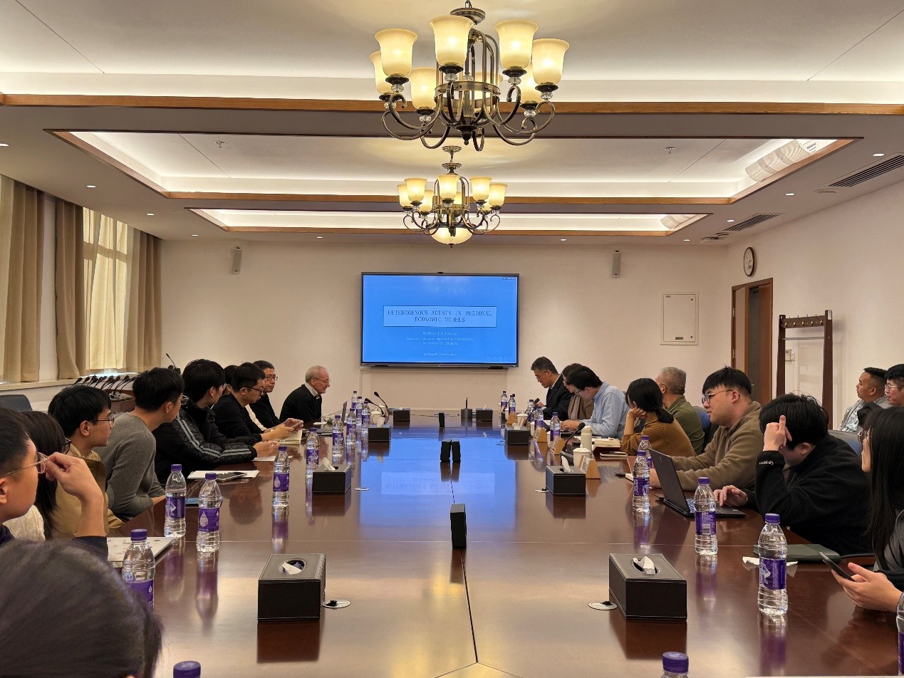 2026年1月12日,美国伊利诺伊大学香槟分校(UIUC)教授、博导、区域经济应用实验室前主任、国际著名区域经济学家Geoffrey J.D. Hewings应邀访问我院,开展学术交流并作专题报告。Hewings教授曾担任国际区域科学协会(RSAI)和北美区域科学协会(NARSC)主席,在区域科学领域享有崇高声誉,发表高水平学术论文百余篇,出版专著14部,曾获颁区域科学领域最高荣誉之一的“怀特艾萨德突出学者成就奖”。